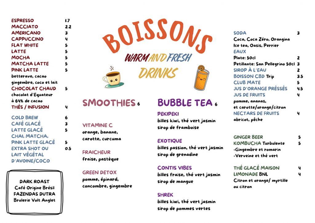 de spécialité en provenance de la Brûlerie VOLT à Hossegor (40) en extraction à froid, frappés, lattes, toutes les joies de l’arabica sont à votre portée. ou notre sélection de thés, Bubble Tea, de chaï, de matchas et nos smoothies, jus ou nectars vitaminés.