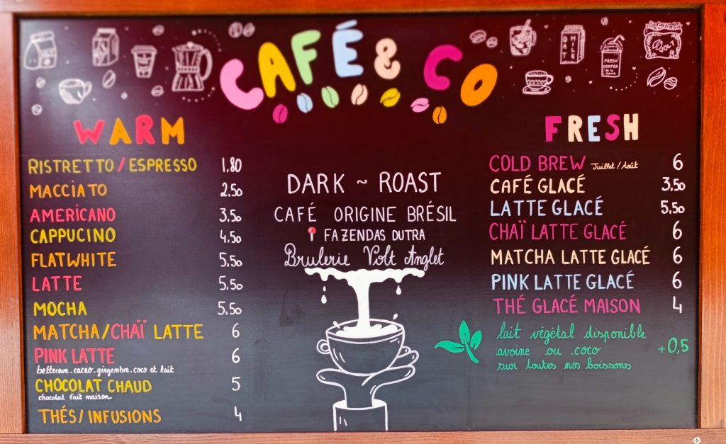cafés de spécialité en provenance de la Brûlerie VOLT à Hossegor (40) en extraction à froid, frappés, lattes, toutes les joies de l’arabica sont à votre portée. ou notre sélection de thés, Bubble Tea, de chaï, de matchas et nos smoothies, jus ou nectars vitaminés.