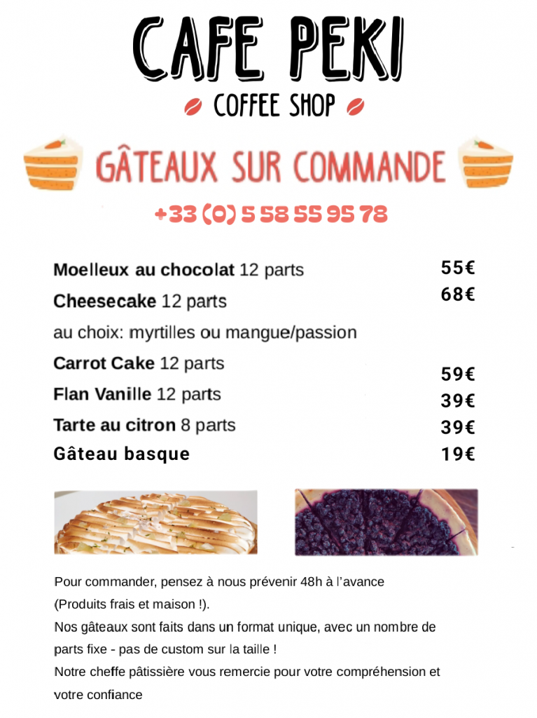 Vous souhaitez commander du sucré, du salé, un gâteau, des pâtisseries, des mignardises ou tout un buffet, n’hésitez pas à nous solliciter, toute l’équipe du Café Péki se fera un plaisir de vous répondre.